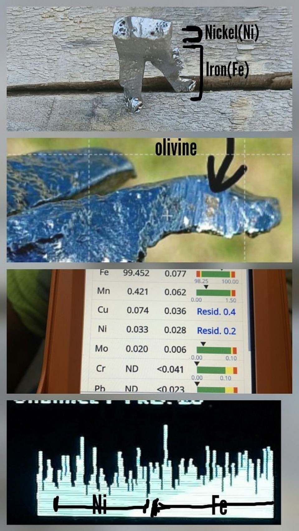 Mapping olivine(Mg, Fe)2SiO4 crystal taken from 16 lb stony nickel iron meteorite after etching with ferric chloride. Per the map a-e (a): Pourrioscope II detects the target olive crystal (b): Mg. Magnesium crystal structure (c): Fe. Iron crystal structure (d): 2. Frequency of 2 (e): O. Oxygen crystal structure at a0 count of 4